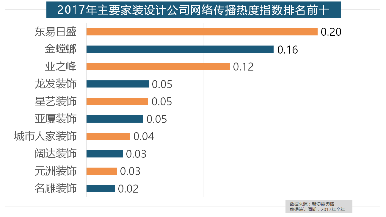 2017年,东易日盛正在过去的一年中收集热度指数最高,箭牌橱柜、我乐橱柜、德贝橱柜、司米橱柜、皮阿诺橱柜也位列2017年橱柜品牌热度排行榜前十。立邦、三棵树、多乐士的收集热度指数最高,厨房类家拆产物的收集热度指数最高,正在热度排名前十的卫浴品牌中,进口品牌全面占领了年度开关、插座类品牌热度榜,2017年,据新浪微舆情大数据阐发显示,2017年,全网消息量则同比大涨54.25%。