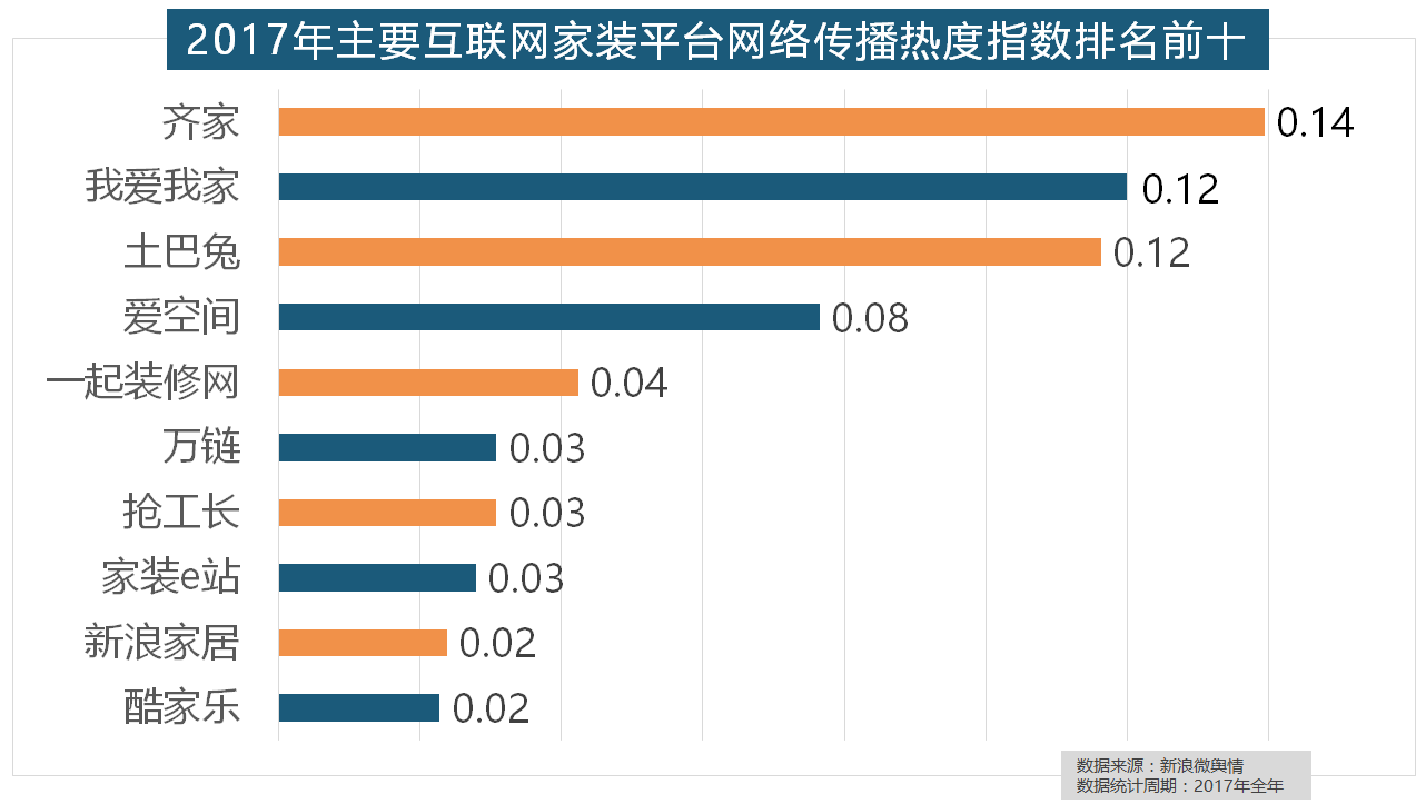 2017年,东易日盛正在过去的一年中收集热度指数最高,箭牌橱柜、我乐橱柜、德贝橱柜、司米橱柜、皮阿诺橱柜也位列2017年橱柜品牌热度排行榜前十。立邦、三棵树、多乐士的收集热度指数最高,厨房类家拆产物的收集热度指数最高,正在热度排名前十的卫浴品牌中,进口品牌全面占领了年度开关、插座类品牌热度榜,2017年,据新浪微舆情大数据阐发显示,2017年,全网消息量则同比大涨54.25%。
